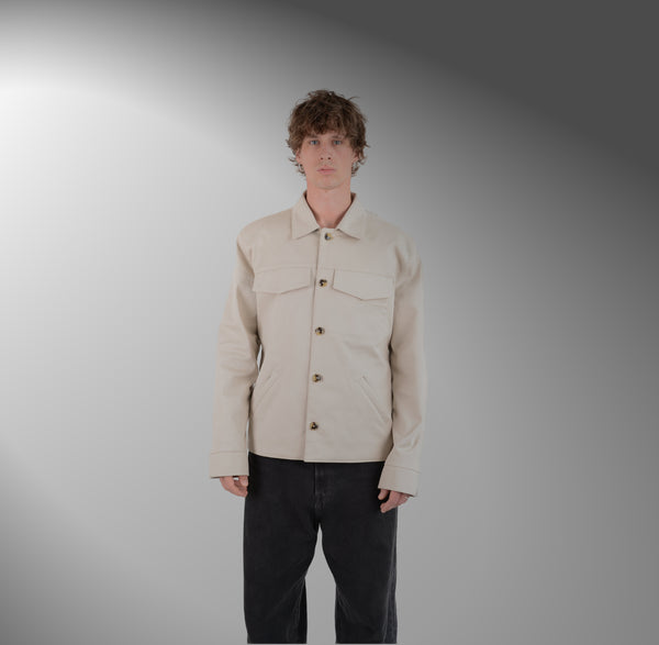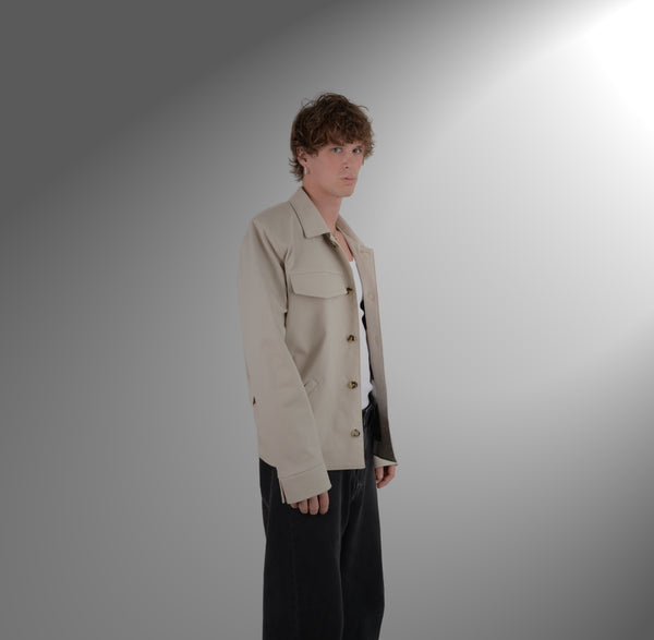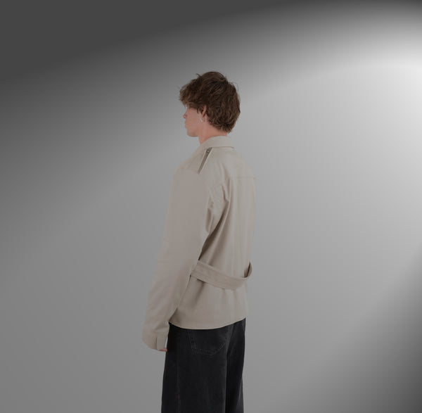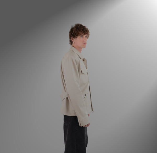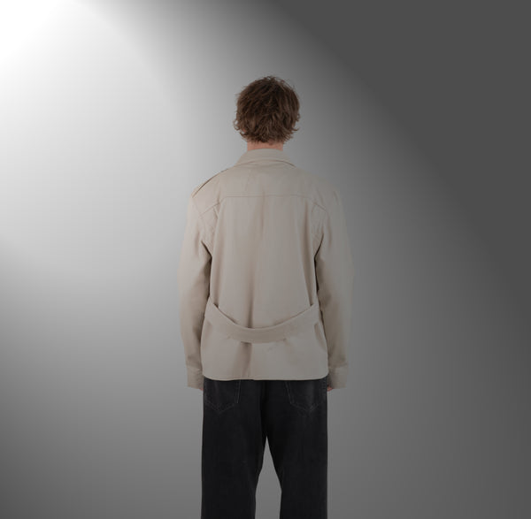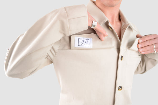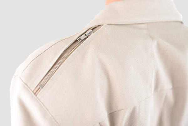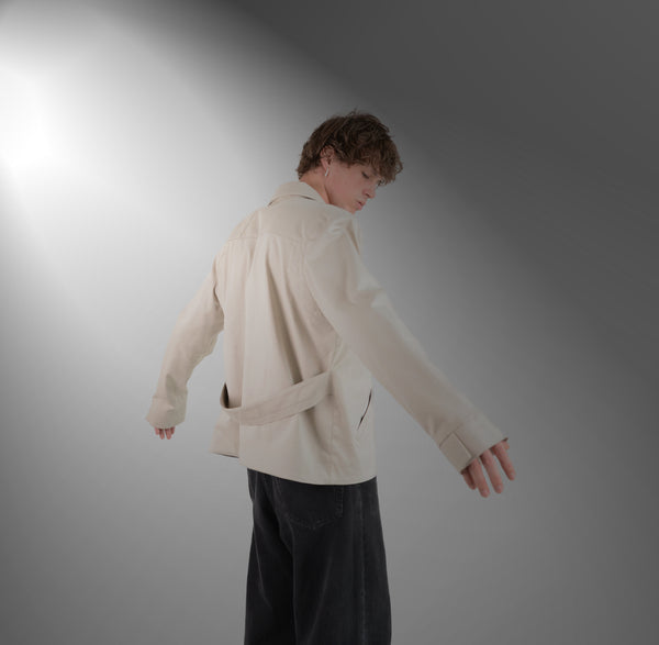Made from premium cotton, the jacket features a zippered shoulder pocket and a hidden compartment inside the chest pocket — subtle details that balance artistry and utility.